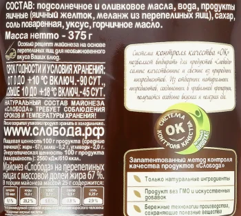 Майонез СЛОБОДА на перепелиных яйцах 67%, 400мл400 г199 ₽