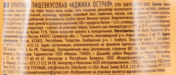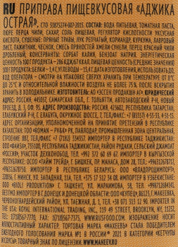 Вода питьевая, томатная паста, пюре перца чили, сахар, соль пищевая, регулятор кислотности – уксусная кислота, сушеные ингредиенты(пряные травы, лук репчатый, кориандр, куркума, лавровый лист, пажитник, чеснок, смесь пряностей хмели-сунели, перец красный чилидробленый), консерванты (сорбат калия, бензоат натрия).