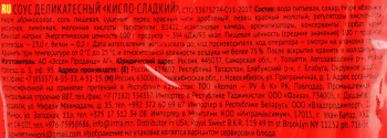 Вода питьевая, сахар, пюре яблочное, соус соевый: сушеные соевые бобы, пшеница, соль пищевая, загустители: крахмал кукурузныймодифицированный, ксантановая камедь, регуляторы кислотности: уксусная и молочная кислоты, ароматизаторы, краситель сахарный колерIV, консерванты: сорбат калия, бензоат натрия.