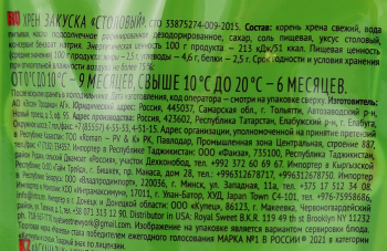 Вода питьевая, корень хрена свежий, масло подсолнечное рафинированное дезодорированное, сахар, соль пищевая, уксус столовый,консервант бензоат натрия.