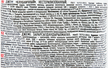 Клубника, сахар, глюкозно-фруктозный сироп, загуститель – пектины, регулятор кислотности – лимонная кислота.