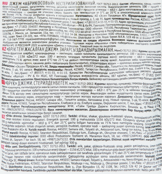 Абрикосы, сахар, глюкозно-фруктозный сироп, загуститель – пектины, регулятор кислотности – лимонная кислота.