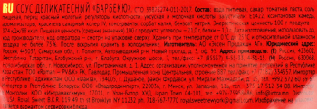 Вода питьевая, сахар, томатная паста, соль пищевая, перец красный молотый, регуляторы кислотности: уксусная и молочная кислоты,загустители: крахмал кукурузный модифицированный, ксантановая камедь, ароматизаторы, краситель сахарный колер IV, консерванты:сорбат калия, бензоат натрия.