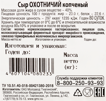 • Сыр МЗ ГИАГИНСКИЙ Охотничий 40%, без змж, 80г