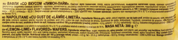 Мука пшеничная хлебопекарная высшего сорта (содержит глютен), сахар, жир кондитерский (рафинированные дезодорированные растительныемасла в натуральном и модифицированном виде (пальмовое, пальмоядровое, подсолнечное), эмульгатор: соевый лецитин, антиокислитель:концентрат смеси токоферолов), сыворотка молочная сухая, крахмал кукурузный, соль, продукты яичные сухие: меланж, эмульгатор:лецитин соевый, краситель натуральный: лютеин, ароматизатор натуральный: лимон-лайм, регулятор кислотности: лимонная кислота,разрыхлитель: гидрокарбонат натрия, вода питьевая. Может содержать следы арахиса, орехов.