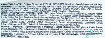 Aqua, Cetearyl Isononanoate, Ceteareth-20, Cetearyl Alcohol, Glyceryl Stearate, Glycerin, Cetyl Palmitate, Ceteareth-12, Polysorbate20, Panthenol, Aloe Barbadensis Leaf Extract, Chamomilla Recutita Flower Extract, Сalendula Officinalis Flower Extract, Lactic Acid,Dipropylene Glycol, Phenoxyethanol, 2-Bromo 2-Nitropropan-1,3-Diol, Trideceth-9, Iodopropynyl Butylcarbamate, Parfum, BenzylSalicylate, Coumarin, Hexyl Cinnamal, Linalool, Geraniol.