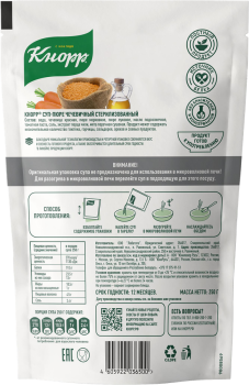 Вода, чечевица красная, пюре морковное, пюре луковое, масло подсолнечное, томатная паста, соль, экстракт перца чили, мята перечнаясушеная.
