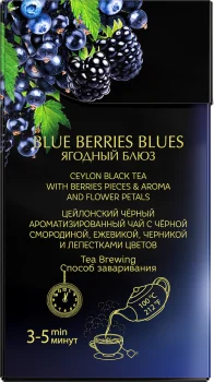 Листовой черный чай, ароматизатор черная смородина, крыжовник и слива, кусочки черной смородины, кусочки ежевики, кусочки черники,лепестки цветов василька.