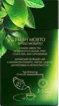 Зеленый листовой чай, ароматизатор мохито, цедра цитрусовых, мята, лимонник.