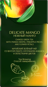 Зеленый листовой чай, кусочки ананаса, ароматизатор манго, лепестки розы, лепестки цветов апельсина.