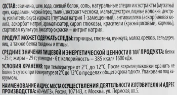 Свинина, шпик, вода, филе куриное, соевый белок, соль, натуральныеспеции и их экстракты (кардамон, мускатный орех, перец, чеснок, тмин),мальтодекстрин, пищевые волокна, виноградный сахар, усилитель вкуса иаромата (глутамат натрия 1 — замещенный), антиокислители (аскорбиноваякислота, аскорбат натрия), ароматизатор, сироп глюкозы, красители(красный рисовый, кармины), стартовая культура, фиксатор окраски-нитритнатрия. Продукт может содержать следы: горчицы, глютена, кунжута,молока, орехов, сельдерея, сои, яиц, а также белка говядины.