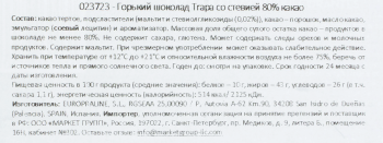 Какао тертое, подсластители (мальтит, стевиоловые гликозиды (0,02%)), какао-порошок с низким содержанием жира, масло какао,эмульгатор (не содержащий ГМ соевый лецитин), ароматизатор.