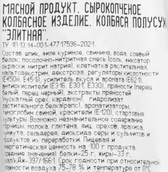 Шпик, филе куриное, свинина, вода, соевый белок, животный белок (говяжий), посолочно-нитритная смесь (соль, фиксатор окраски:нитрит натрия), клетчатка растительная, мальтодекстрин, декстроза, регуляторы кислотности (Е450iii, Е451i), усилитель вкуса иаромата (Е621), антиокислители (Е316, Е301, Е330), пряности (перец белый, перец черный), экстракты пряностей (мускатный орех,кардамон), гидролизат растительного белка(рапс), ароматизаторы, гемоглобин свиной, красители (Е120), стартовые культуры. Возможнонезначительное содержание горчицы, молока, глютена, яиц, орехов, арахиса, кунжута, сельдерея, диоксида серы и сульфитов и продуктових переработки. Дату изгот. и срок годности см. на этикетке изделия, срок годности указан с даты упаковки
