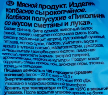 Свинина, шпик, филе птицы, животный белок (свиной, говяжий), нитритно-посолочная смесь (соль, фиксатор окраски нитрит натрия),растительное масло, сахар, специи (перец белый), антиокислитель (изоаскорбат натрия), усилитель вкуса и аромата (глутамат натрия),экстракт паприки, краситель (красный рисовый, кармин), ароматизатор, стартовые культуры. Продукт может содержать следы орехов,сои, глютена, лактозы, молока и продуктов их переработки.