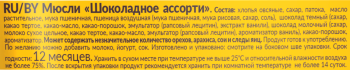 хлопья овсяные,мука пшеничная,патока,сахар,пшеница воздушная мука пшеничная,мука рисовая,сахар,соль,масло подсолнечноевысокоолеиновое,шоколад тёмный сахар,какао тертое,какао масло,эмульгатор: лецитин подсолнечный,ароматизатор натуральный»ваниль»,шоколад молочный сахар,молоко сухое цельное,какао масло,какао тертое,молоко сухое обезжиренное,эмульгатор: лецитинподсолнечный,ароматизатор натуральный «ваниль»,какао-порошок,ароматизатор натуральный,антиокислители: кислотааскорбиновая,токоферолы,концентрат смеси; эмульгатор: лецитин соевый.После вскрытия упаковки продукт рекомендуется хранить прикомнатной температуре не более 14 суток.СГ — 365 дней