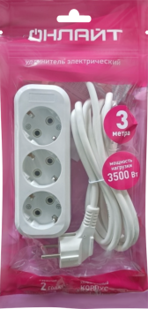 Технические параметры: Оснащение кабелем/проводом ПВС Модель/исполнение Удлинитель Количество жил 3 Общ. количество розеток/гнезд 3Форма корпуса Прямоугольн. Количество штепсельных розеток с заземляющим контактом 3 Номин. ток 16 А Поперечное сечение жилы 1 мм?Материал Пластик Цвет Белый Степень защиты (IP) IP20 Длина кабеля питания 3 м Угол поворота центральной вставки 45