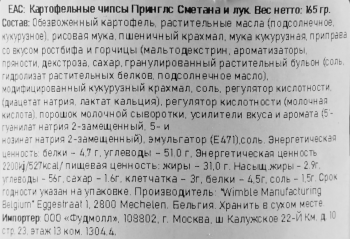 Обезвоженный картофель, растительные масла (подсолнечное, кукурузное), рисовая мука, пшеничный крахмал, мука кукурузная, приправа совкусом сметаны и лука (луковый порошок, декстроза, сахар, сладкий сывороточный порошок, порошок сметаны, ароматизаторы, сиропглюкозный, картофельный крахмал, лактоза, молочный белок, регуляторы кислотности (лимонная кислота, молочная кислота, яблочнаякислота), дрожжевой экстракт), эмульгатор (E471), мальтодекстрин, соль, краситель (аннато).