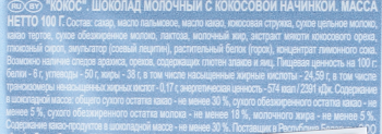 Сахар, масло пальмовое, масло какао, кокосовая стружка, сухое цельное молоко, какао тертое, сухое обезжиренное молоко, лактоза,молочный жир, экстракт мякоти кокосового ореха, глюкозный сироп, эмульгатор (соевый лецитин), растительный белок (горох), концентратлимонного сока. Возможно наличие следов арахиса, орехов, содержащих глютен злаков и яиц. Содержание в шоколадной массе: общегосухого остатка какао – не менее 30%, сухого обезжиренного остатка какао – не менее 5%, сухого обезжиренного остатка молока – неменее 18%, молочного жира – не менее 5%.