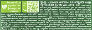 Сахар, ядро миндаля обжаренное, масло какао, какао тертое, сухое цельное молоко, лактоза, сухое обезжиренное молоко, молочный жир,эмульгатор (соевый лецитин). Возможно наличие следов арахиса, других орехов, содержащих глютен злаков и яиц. Содержание в шоколадноймассе: общего сухого остатка какао – не менее 30%, сухого обезжиренного остатка какао – не менее 5%, сухого обезжиренного остаткамолока – не менее 18%, молочного жира – не менее 5%. Содержание какао-продуктов в шоколадной массе – не менее 30%.