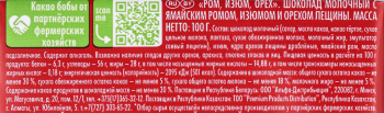 Сахар, масло какао, изюм, какао тертое, сухое цельное молоко, орех лещины дробленый, лактоза, сухое обезжиренное молоко, молочныйжир, ямайский ром, эмульгатор (соевый лецитин). Содержит алкоголь. Возможно наличие следов арахиса, других орехов, содержащих глютензлаков и яиц. Содержание в шоколадной массе: общего сухого остатка какао – не менее 30%, сухого обезжиренного остатка какао – неменее 5%, сухого обезжиренного остатка молока – не менее 18%, молочного жира – не менее 5%. Содержание какао-продуктов в шоколадноймассе – не менее 30%.
