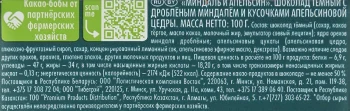 Сахар, какао тертое, масло какао, миндаль дробленый, апельсиновая цедра, молочный жир, глюкозно-фруктозный сироп, эмульгатор (соевыйлецитин), концентрат лимонного сока, апельсиновое масло, декстроза. Возможно наличие следов арахиса, орехов, глютена злаков и яиц.Содержание в шоколадной массе: общего сухого остатка какао – не менее 50%, сухого обезжиренного остатка какао – не менее 18%, сухогообезжиренного остатка молока – не менее 1%, молочного жира – не менее 1%. Содержание какао-продуктов в шоколадной массе – не менее50%.