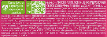 Сахар, кусочки клюквы (клюква, сахар, рисовая мука, масло подсолнечное), масло какао, какао тертое, сухое цельное молоко, лактоза,орех лещины дробленый, сухое обезжиренное молоко, молочный жир, эмульгатор (соевый лецитин). Возможно наличие следов арахиса, другихорехов, содержащих глютен злаков и яиц. Содержание в шоколадной массе: общего сухого остатка какао: не менее 30 %, сухогообезжиренного остатка какао: не менее 5 %, сухого обезжиренного остатка молока: не менее 18 %, молочного жира: не менее 5 %.Содержание какао-продуктов в шоколадной массе: не менее 30 %.