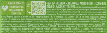 Шоколад молочный (сахар, масло какао, какао тертое, сухое цельное молоко, лактоза, сухое обезжиренное молоко, молочный жир,эмульгатор соевый лецитин), кешью соленый дробленый (кешью, соль). Возможно наличие следов арахиса, орехов, глютена злаков и яиц.