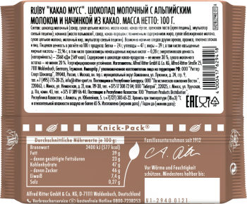 Шоколад молочный RITTER SPORT Какао-мусс с альпийским молоком и начинкой из какао, 100г100 г319,90 ₽