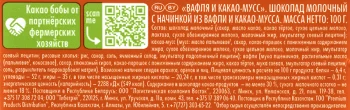 Шоколад молочный (сахар, масло какао, какао тертое, сухое цельное молоко, лактоза, сухое обезжиренное молоко, молочный жир,эмульгатор соевый лецитин), какао-мусс (мусс: масло пальмовое, сахар, какао-порошок с пониженным содержанием жира, сухоеобезжиренное молоко, сухое цельное молоко, молочный жир, эмульгатор соевый лецитин, рисовые хлопья: рис, сахар, соль, эмульгаторсоевый лецитин, ячменный солод), вафля (мука пшеничная, кокосовое масло, глюкозный сироп, сахар, сухая молочная сыворотка, соеваямука, какао-порошок с пониженным содержанием жира, сухое обезжиренное молоко, какао тертое, ячменный солод, эмульгатор соевыйлецитин, соль, ореховая паста (орех лещины), бурбонская ваниль (молотая), корица, разрыхлители (гидрокарбонат натрия,дигидропирофосфат натрия)). Возможно наличие следов арахиса, орехов и яиц.
