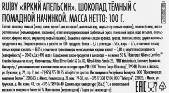 Шоколад темный (сахар, какао тертое, масло какао, молочный жир, эмульгатор соевый лецитин), начинка (сахар, масла растительные(пальмоядровое, кокосовое), агент влагоудерживающий сорбитовый сироп, глюкозный сироп, вода питьевая, апельсиновое эфирное масло,эмульгатор соевый лецитин).