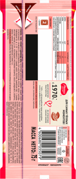 Сахар, патока, молоко сухое цельное, масло какао, арахис жареный дробленый, какао тертое, сыворотка молочная сухая, молочный жир,жир специального назначения (из пальмового масла), вода, соль, эмульгаторы – лецитины, Е476, ароматизаторы натуральные. Молочныйшоколад содержит: общий сухой остаток какао – не менее 25%.