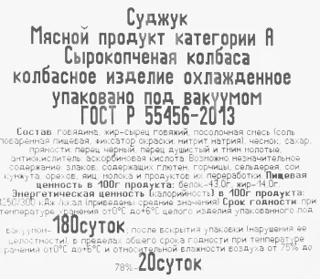 Говядина, жир-сырец говяжий, посолочная смесь (соль поваренная пищевая, фиксатор окраски нитрит натрия), чеснок, сахар, пряности:перец черный, перец душистый и тмин молотые, антиокислитель: аскорбиновая кислота. Возможно незначительное содержание злаков,содержащих глютен, горчицы, сельдерея, сои, кунжута, орехов, яиц, молока и продуктов их переработки. Дату изгот. и срок годности см.на этикетке изделия, срок годности указан с даты упаковки