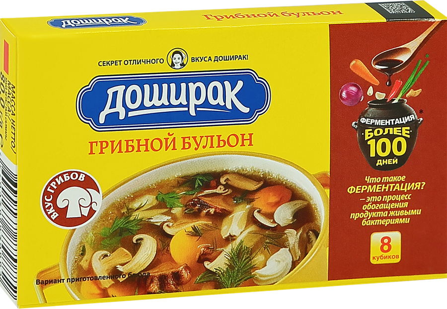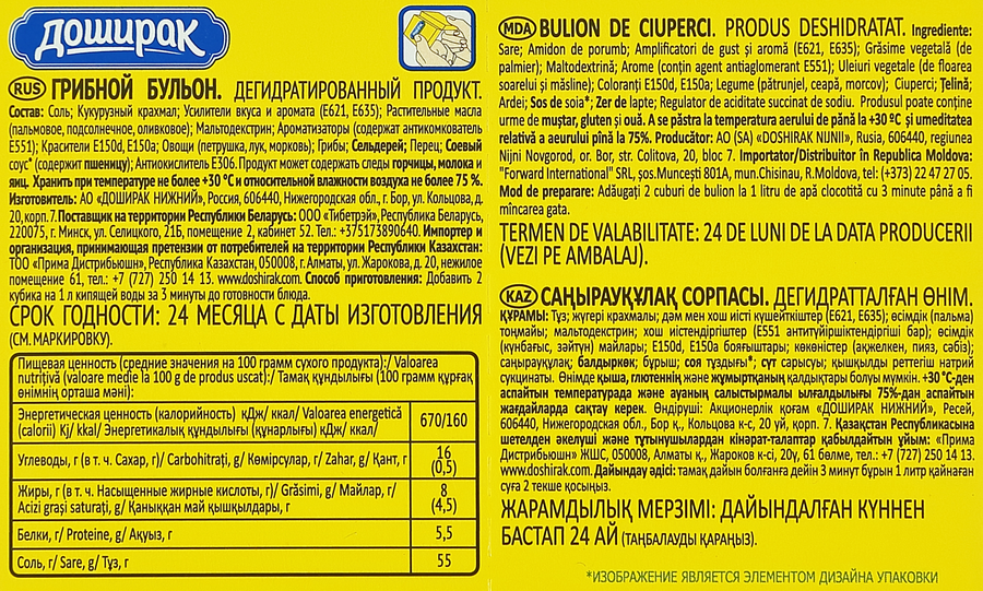 Соль, кукурузный крахмал, усилители вкуса и аромата (Е621, Е635), растительные масла (пальмовое, подсолнечное, оливковое),мальтодекстрин, ароматизаторы (содержат антикомкователь – Е551), красители (Е150d, Е150а), овощи (петрушка, лук, морковь), грибы,сельдерей, перец, соевый соус (содержит пшеницу), антиокислитель – Е306.