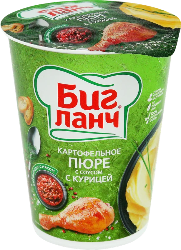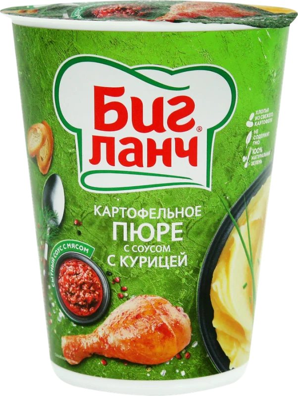 Пюре картофельное БИГ ЛАНЧ с соусом с курицей – картофельное пюре быстрого приготовления. Подходит для перекуса на работе, на учебе, на отдыхе или на природе. Удобно брать с собой, быстро заваривается. Утилизируется как бытовой отход – не надо носить с собой миски и контейнеры.