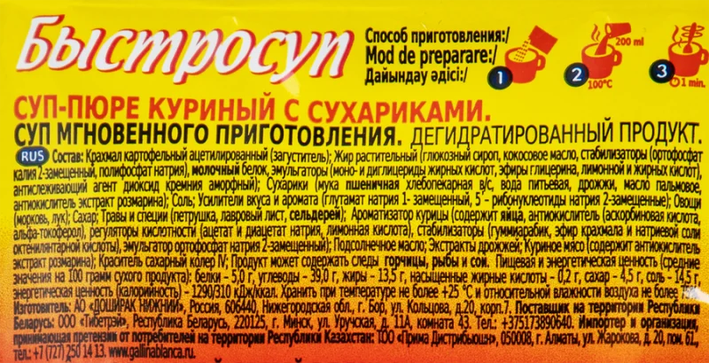 Крахмал картофельный ацетилированный (загуститель); Жир растительный(глюкозный сироп, кокосовое масло, стабилизаторы (орто-фосфат калия 2-замещенный, полифосфат натрия), молочный белок, эмульгаторы (моно- идиглицериды жирных кислот, эфиры глицерина, лимонной и жирных кислот),антислеживающий агент диоксид кремния аморфный); Сухарики (мукапшеничная хлебопекарная в/с, вода питьевая, дрожжи, масло пальмовое,пальмовый стеарин); Соль; Усилители вкуса и аромата (глутамат натрия 1-замещенный, 5– рибонуклеотиды натрия 2-замещенные); Овощи (морковь,лук); Сахар; Травы и специи (петрушка, лавровый лист, сельдерей);Ароматизатор курицы (содержит яйца, антиокислитель (аскорбиноваякислота, альфа-токоферол), регуляторы кислотности (ацетат и диацетатнатрия, лимонная кислота), стабилизаторы (гуммиарабик, эфир крахмала инатриевой соли октенилянтарной кислоты), эмульгатор орто-фосфат натрия2-замещенный); Подсолнечное масло; Экстракты дрожжей; Куриное мясо(содержит антиокислитель экстракт розмарина); Красители (сахарный колерIV); Продукт может содержать следы рыбы и сои.