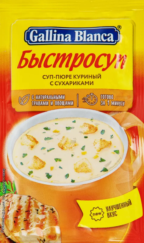 Густой, нежный и питательный суп-пюре GALLINA BLANCA Быстросуп Куриный с сухариками подходит для обеденного перекуса и готовится за 1 минуту. Благодаря кремовой консистенции этот суп легко усваивается, дарит ощущение сытости надолго. Удобно брать с собой в поездку, на работу, в поход или путешествие.