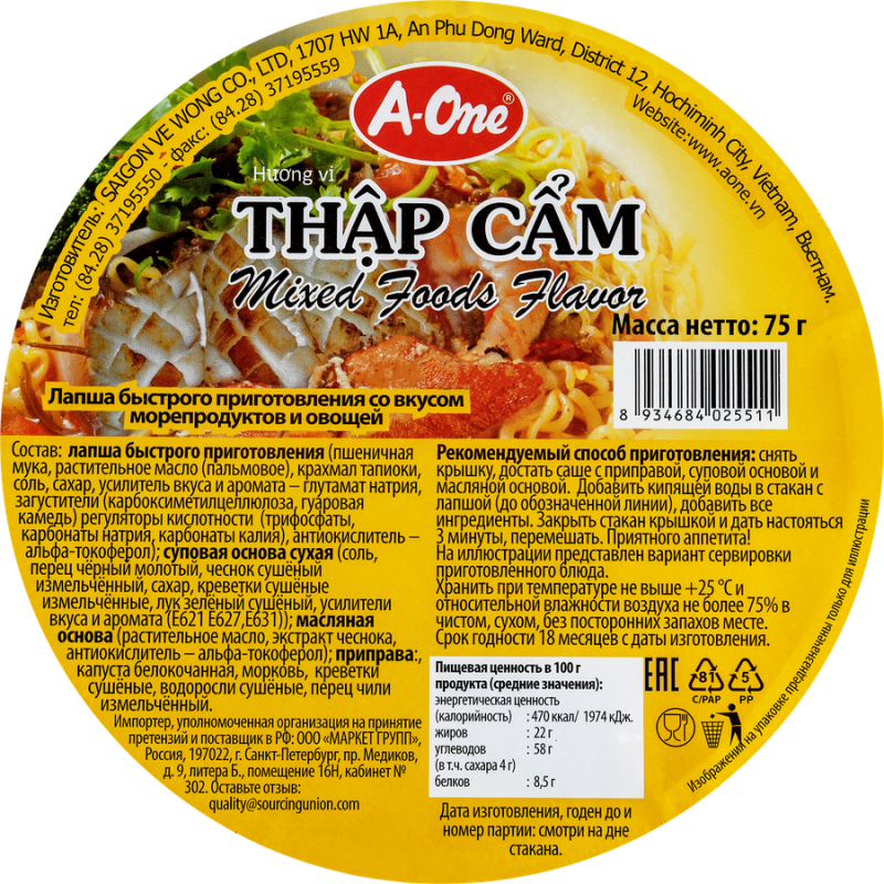 Лапша A-ONE со вкусом морепродуктов и овощей, 75г