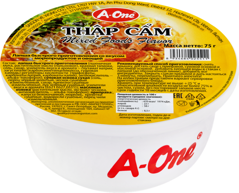 Лапша A-ONE со вкусом морепродуктов и овощей позволит быстро приготовить сытное и питательное блюдо. Такой продукт особенно понравится любителям паназиатской кухни и выручит в случае нехватки времени. Лапша может использоваться в качестве обеда или ужина как дома, так и на работе, в походах, во время поездок.