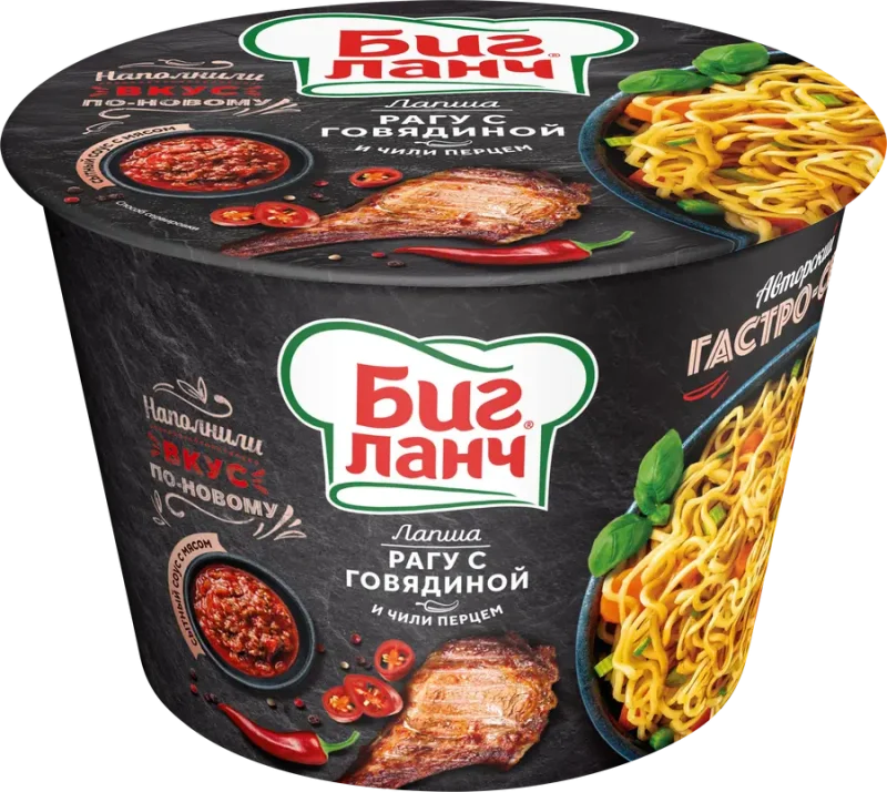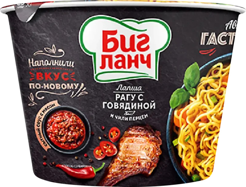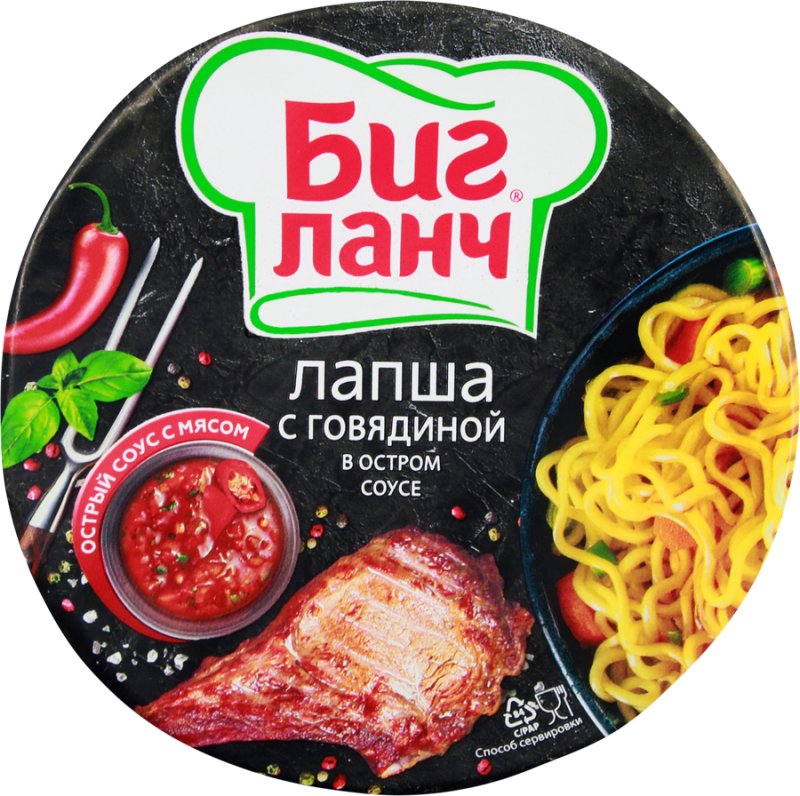 Лапша БИГ ЛАНЧ с говядиной в остром соусе – лапша быстрого приготовления. Подходит для перекуса на работе, на учебе, на отдыхе или на природе. Удобно брать с собой, быстро заваривается. Утилизируется как бытовой отход – не надо носить с собой миски и контейнеры.