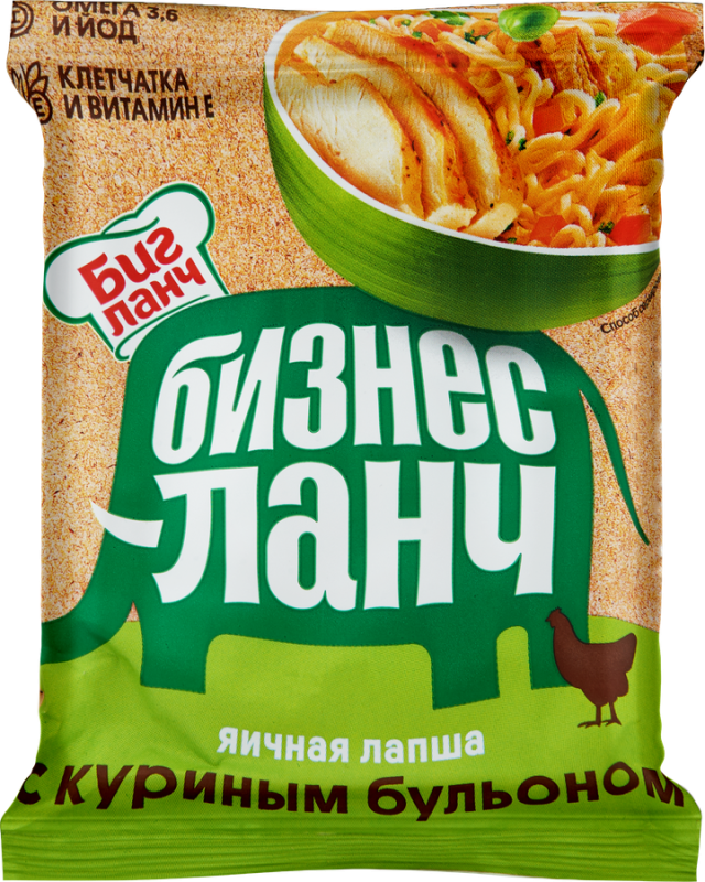 Лапша БИЗНЕС ЛАНЧ Яичная с куриным бульоном позволит быстро приготовить сытное и питательное блюдо. Такой продукт выручит в случае нехватки времени, может использоваться в качестве обеда или ужина на работе, в походах, во время поездок. Содержит натуральные овощи, клетчатку, омега 3,6, витамин Е и йод. Достаточно залить лапшу кипящей водой и немного подождать.