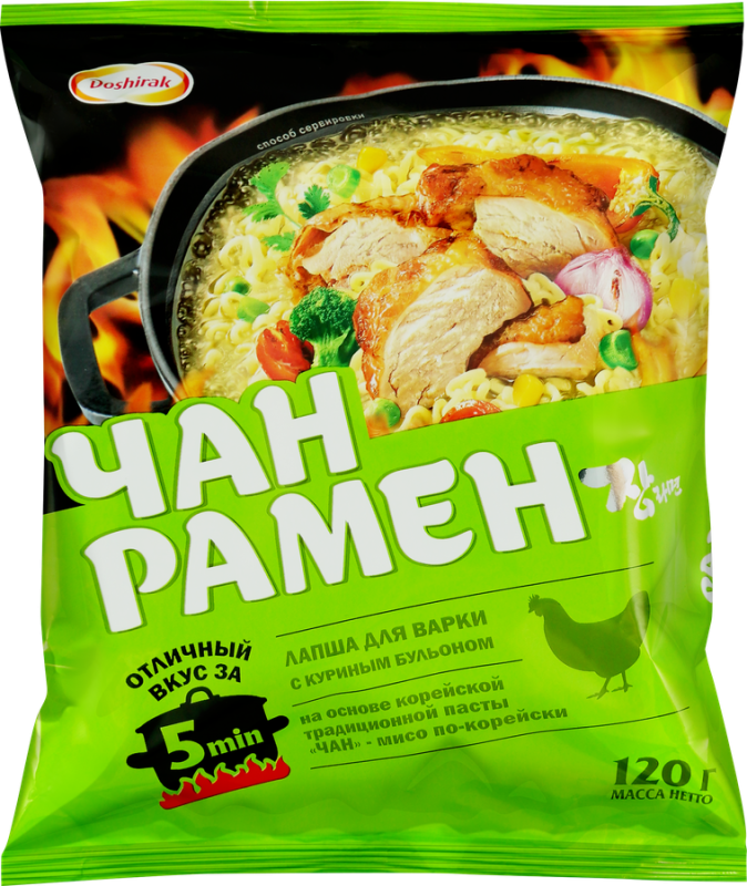 Лапша ДОШИРАК Чан рамен с куриным бульоном с оригинальным вкусом станет еще ярче, если ее сварить. Традиционная корейская лапша быстрого приготовления, индивидуальная порция из высококачественнойпшеничной муки с добавлением овощей на курином бульоне. Ароматное блюдо на каждый день – суп-лапша или гарнир.