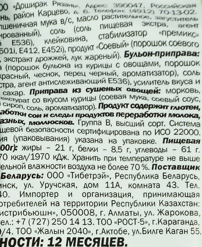Лапша: пшеничная мука высшего сорта, масло растительное, пищевая добавка – загуститель (крахмал ацетилированный), соль, комплекснаяпищевая добавка – эмульгатор К-300А (соевое масло, эмульгатор Е322), клейковина, комплексная пищевая добавка – стабилизаторпремикс (стабилизаторы: Е501i, Е412, Е452i), приправы смешанные (сахар, экстракт дрожжей, растительный протеин, лук, порошоксоевого соуса). Бульон-приправа: бульонная основа (порошок бульона из курицы с овощами, порошок куриный, перец красный, чеснок,перец черный, ароматизатор курица), соль, усилитель вкуса и аромата (Е621), сахар. Приправа из сушеных овощей: морковь, капуста,соевый текстурат со вкусом курицы (ароматизатор курица).