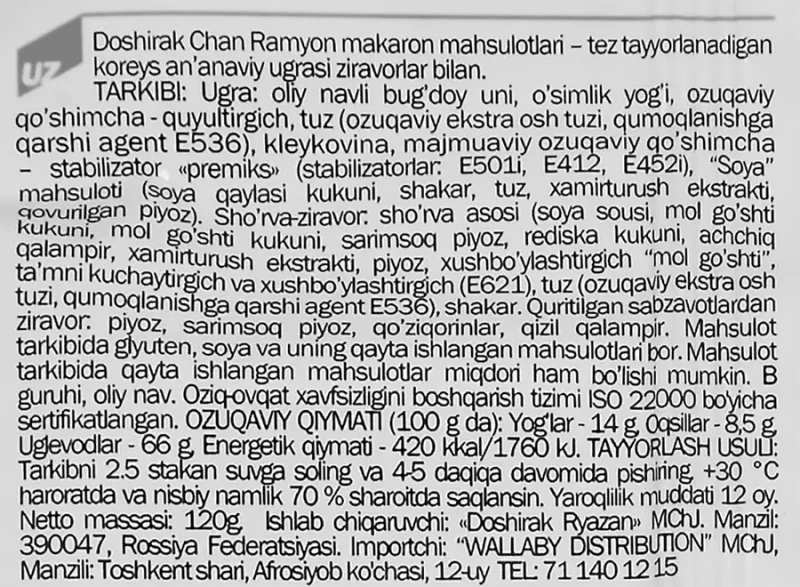 Лапша: пшеничная мука высшего сорта, масло растительное, пищевая добавка – загуститель (крахмал ацетилированный), соль, комплекснаяпищевая добавка – эмульгатор К-300А (соевое масло, эмульгатор Е322), клейковина, комплексная пищевая добавка – стабилизаторпремикс (стабилизаторы: Е501i, Е412, Е452i), приправы смешанные (сахар, экстракт дрожжей, растительный протеин, лук, порошоксоевого соуса). Бульон-приправа: бульонная основа (соус соевый, порошок говядины, чеснок, порошок редиса, перец стручковый острый,экстракт дрожжей, лук, ароматизатор говядина), усилитель вкуса и аромата (Е621), соль, сахар. Приправа из сушеных овощей: лук,чеснок, грибы, паприка красная.