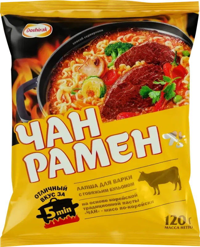 Лапша DOSHIRAK Чан Рамен с приправами – традиционная корейская лапша быстрого приготовления, индивидуальная порция из высококачественной пшеничной муки с приправами, грибами и кусочками говядины. Ароматное блюдо на каждый день – суп-лапша или гарнир.