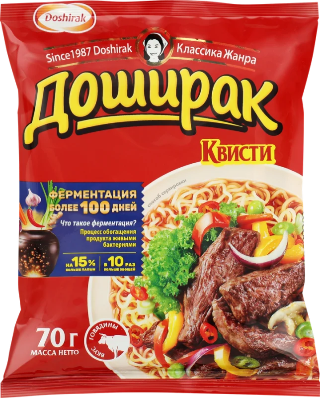 Лапша DOSHIRAK Квисти со вкусом говядины – лапша быстрого приготовления. Это индивидуальная порция лапши быстрого приготовления из высококачественной пшеничной муки, еще больше овощей и кусочки говядины. Ароматное блюдо на каждый день – суп-лапша или гарнир.
