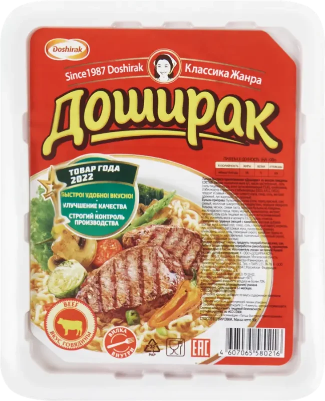 Лапша DOSHIRAK со вкусом говядины – лапша быстрого приготовления, обогащенная йодом, с кусочками говядины. В приправе из сушеных овощей содержится ламинария, богатая полезными для здоровья минералами и витаминами, благодаря которым нормализуется работа щитовидной железы, улучшаются обменные процессы в организме, нормализуется работа сердечно-сосудистой системы, восстанавливается витаминный баланс, снижается уровень холестерина, выводятся радионуклиды и токсины, укрепляется иммунитет.