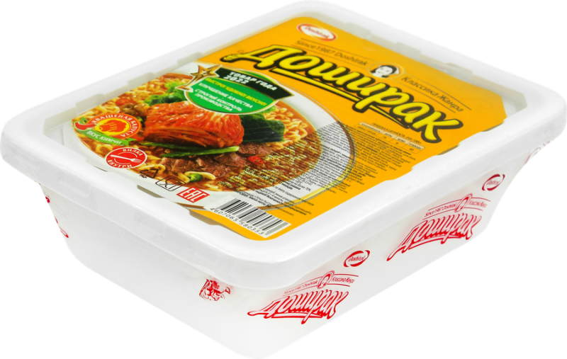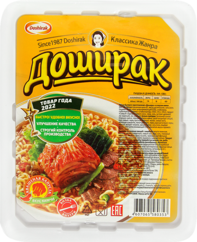 Лапша ДОШИРАК со вкусом кимчи – лапша быстрого приготовления, обогащенная йодом. В приправе из сушеных овощей содержится ламинария, богатая полезными для здоровья минералами и витаминами, благодаря которым нормализуется работа щитовидной железы, улучшаются обменные процессы в организме, нормализуется работа сердечно-сосудистой системы, восстанавливается витаминный баланс, снижается уровень холестерина, выводятся радионуклиды и токсины, укрепляется иммунитет. Кимчи – это древнее блюдо из квашеной капусты, которое обладает приятным остро- сладким вкусом. Богатый множеством элементов, таких как пробиотики, клетчатка, витамины и антиоксиданты, а также с чрезвычайно низким содержанием жира и сахара, кимчи обладает уникальными питательными свойствами.