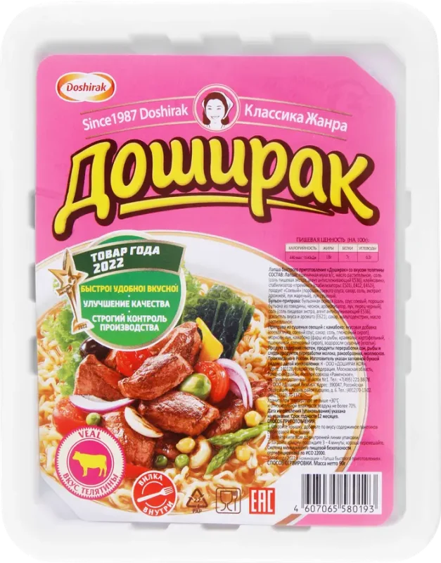 Лапша DOSHIRAK со вкусом телятины – лапша быстрого приготовления, обогащенная йодом, с кусочками телятины. В приправе из сушеных овощей содержится ламинария, богатая полезными для здоровья минералами и витаминами, благодаря которым нормализуется работа щитовидной железы, улучшаются обменные процессы в организме, нормализуется работа сердечно-сосудистой системы, восстанавливается витаминный баланс, снижается уровень холестерина, выводятся радионуклиды и токсины, укрепляется иммунитет.