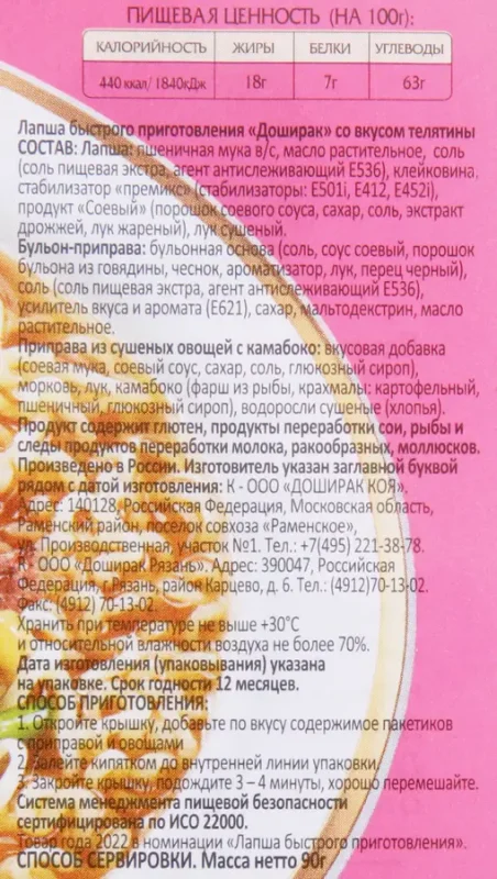 Лапша: пшеничная мука высшего сорта, масло растительное, пищевая добавка – загуститель (крахмал ацетилированный), соль, комплекснаяпищевая добавка – эмульгатор К-300А (соевое масло, эмульгатор Е322), клейковина, комплексная пищевая добавка – стабилизаторпремикс (стабилизаторы: Е501i, Е412, Е452i), приправы смешанные (сахар, экстракт дрожжей, растительный протеин, лук, порошоксоевого соуса), сушеная ламинария (порошок), лук сушеный. Бульон-приправа: бульонная основа (перец красный, соус соевый, молочнаясыворотка, мальтодекстрин, порошок овощного бульона, чеснок, соевая паста, порошок бульона из говядины, масло красного перца, перецчерный, ароматизатор говядина, экстракт паприки), соль, усилитель вкуса и аромата (Е621), сахар, глюкоза. Приправа из сушеныховощей с камабоко: соевый текстурат, морковь, лук, камабоко (продукт рыбный).