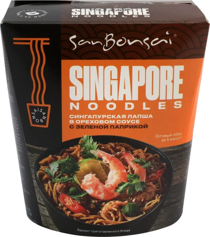 Лапша SANBONSAI Сингапурская, в ореховом соусе с зеленой паприкой – это быстрый способ приготовить вкусный легкий обед в паназиатском стиле. Для приготовления необходимо залить кипятком на 5–7 минут, слить воду и добавить соусы.